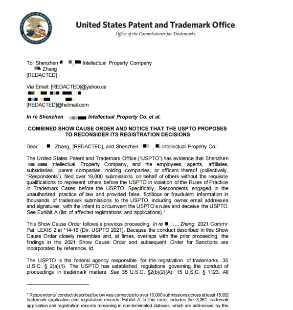 美国专利商标局(USPTO)近日发布了一份重磅的 Show Cause Order(说明理由令),针对深圳这家知产公司及其相关人员,启动大规模调查和拟制裁程序,深圳这家知产公司极其关联方存在大规模商标代理违规行为。