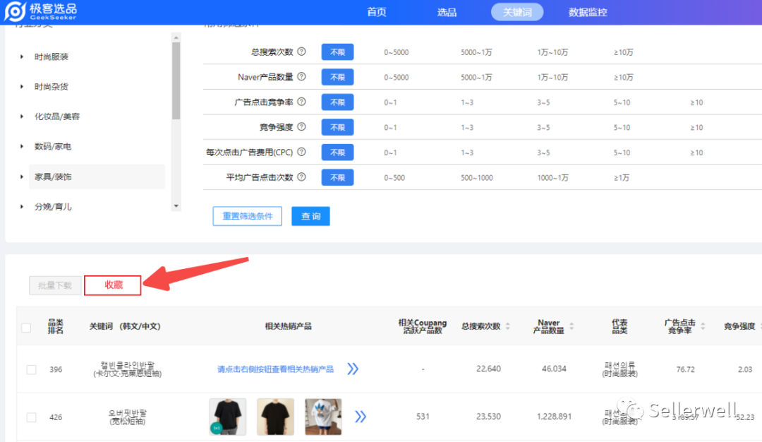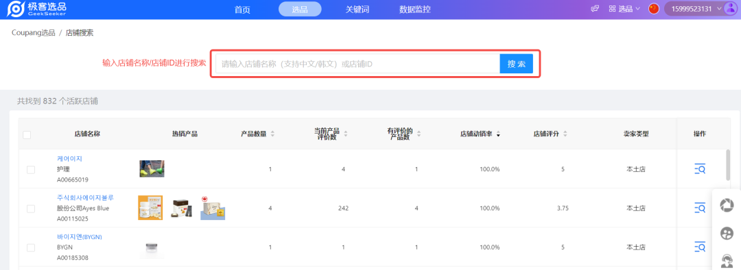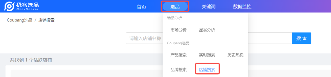 登录极客系统——选品——Coupang选品——店铺搜索