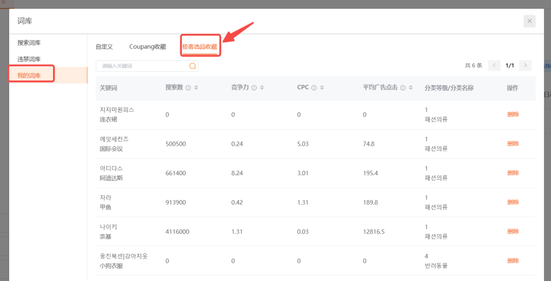 针对选品工具所选的Coupang热词,可一键收藏至ERP系统产品库-词库,设置Coupang关键词时可直接引用,高效运营。