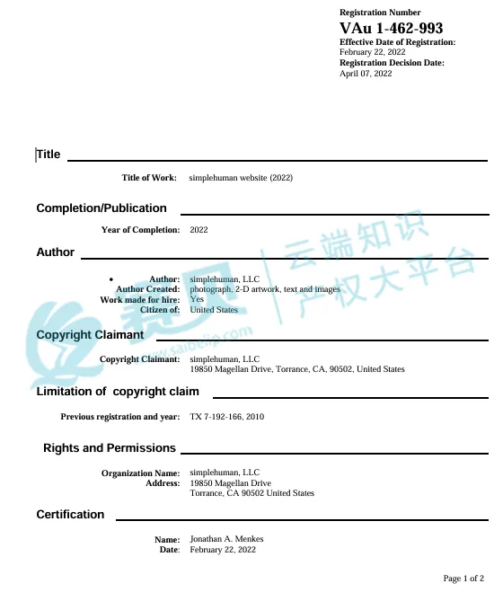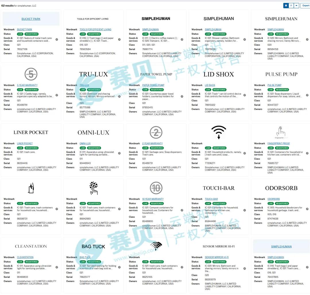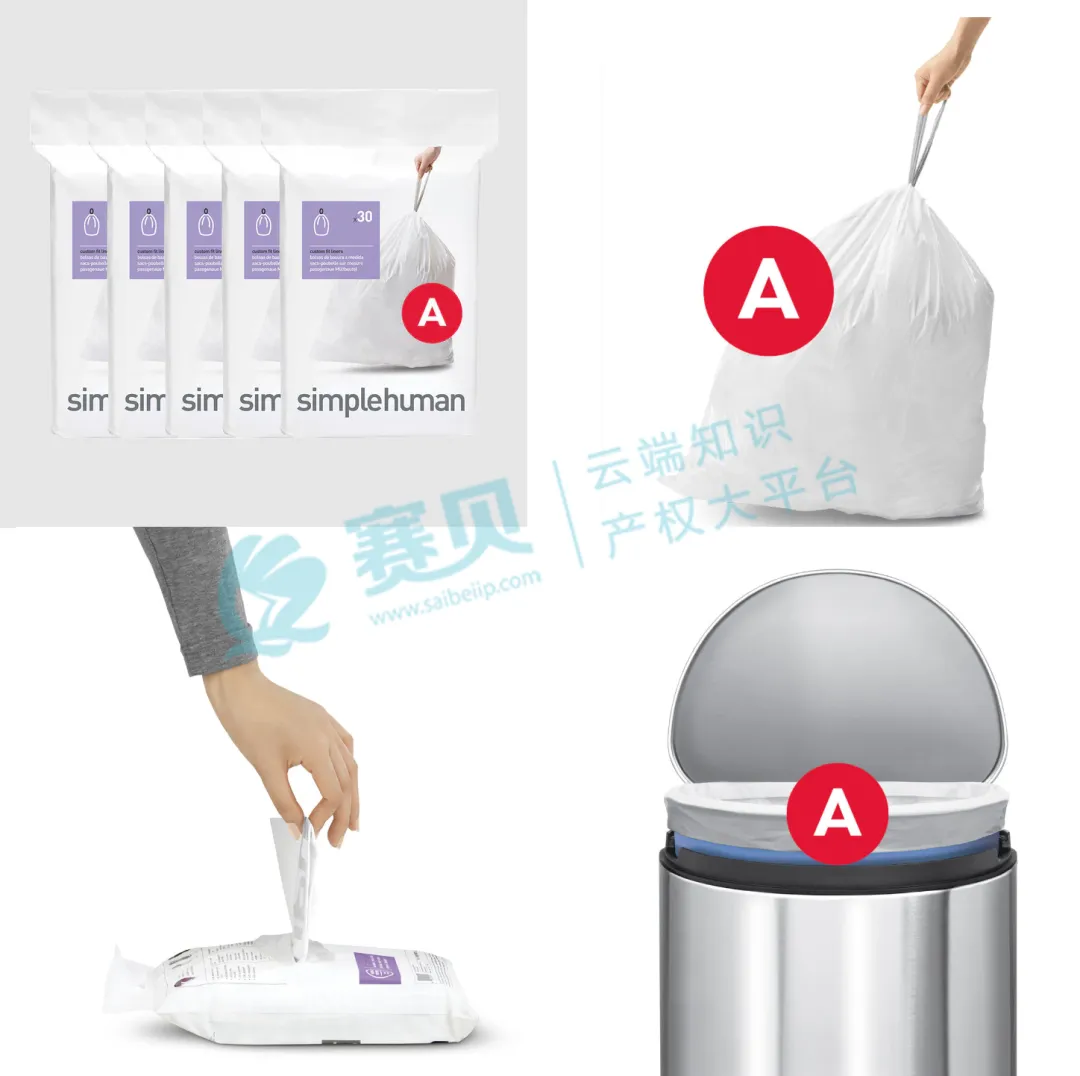 案件目前属于密封状态,案件可能涉及版权VAu 1-462-993及抽绳垃圾袋的商业外观设计,以下simplehuman, LLC已经注册商标和版权,供卖家参考。是赛贝提醒跨境卖家,未经授权不得擅自使用,以免引发侵权风险。
