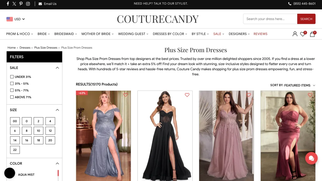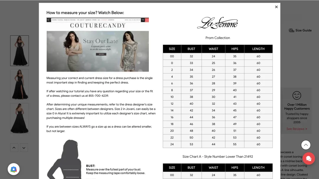 尺码不合是礼服独立站的最大退货原因。Couture Candy 没有回避这一难题,而是通过"全尺码包容+精准测量指导"将痛点转化为差异化优势。