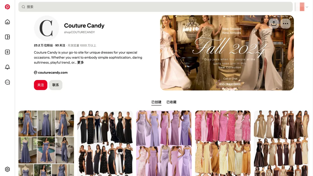 Couture Candy 在 Pinterest 发布近 300 个图集,积累 23.2 万粉丝,90.65% 的社交流量来自该平台。通过高质量场景图(舞会现场、不同光线下的面料质感)建立"时尚专家"的形象。