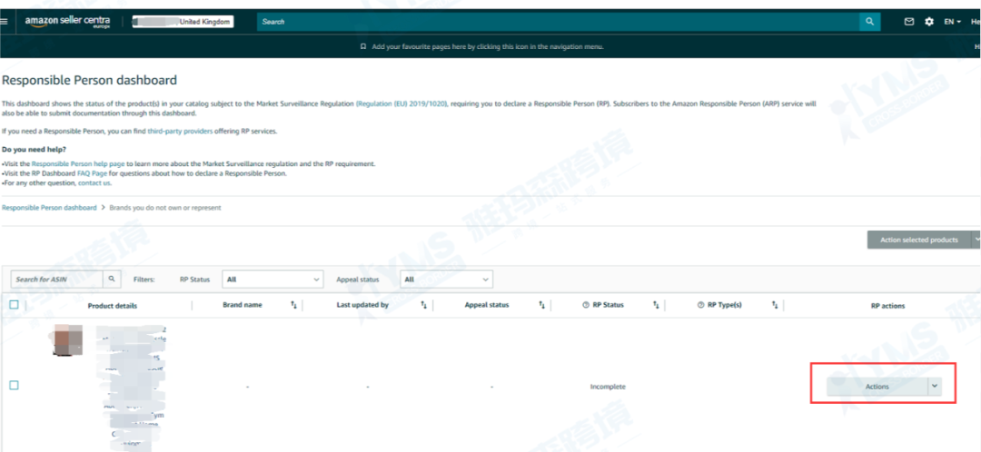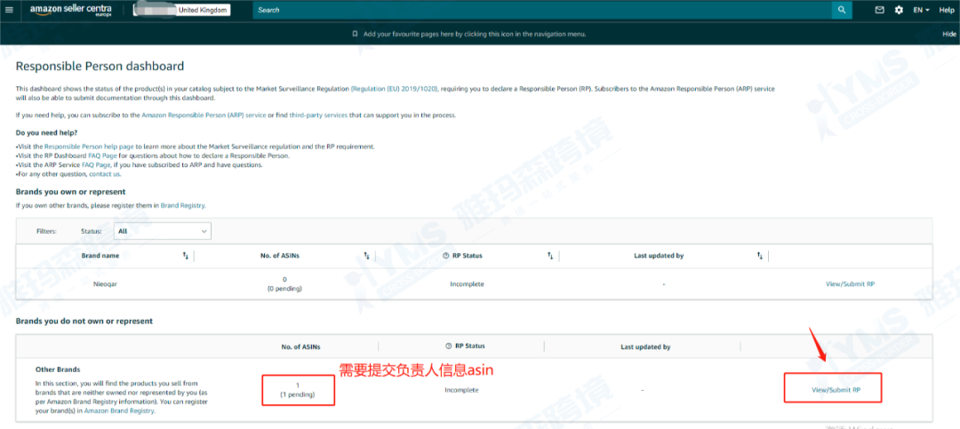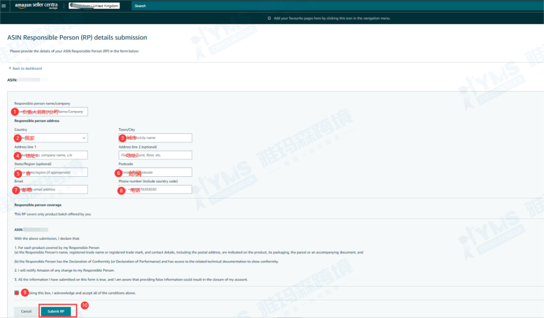 1、登录进入卖家后台,点击“Programme Policies(计划政策)”; 2、点击“Policies,agreements,and guidelines(政策、协议和指南)”; 3、点击“Programme Policies(计划政策)”; 4、点击“Selling on Amazon Fee Schedule(在亚马逊上销售费用表)”; 5、左侧下拉找到“Products requiring additional approvals(需要额外批准的产品)”,点击“Product safety and compliance(产品安全与合规)”; 6、左侧下拉找到“Responsible Person requirement for CE-marked Products(CE标志产品的责任人要求)”,点击“dashboard”进入“负责人”控制面板; 7、可查看到需要提交负责人信息asin,点击“View/Submit RP(查看/提交负责人信息)”; 8、点击“Actions”,填写负责人的名称/公司、地址、邮编、邮件、电话等信息,勾选负责人负责范围、声明,点击“Submit RP(提交)”即可。