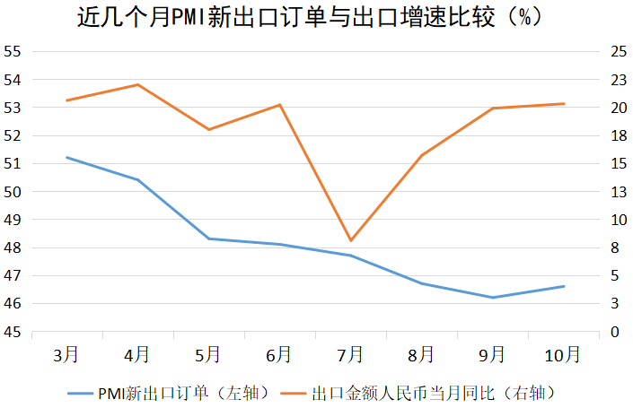 “出口总额大并不一定代表订单非常多,原材料价格上涨和运费价格上涨均可能反映到终端出口总值上。PMI新出口订单指数下滑,表明企业接单数量有所下降。因此,四季度较三季度出口增速大概率会放缓。”