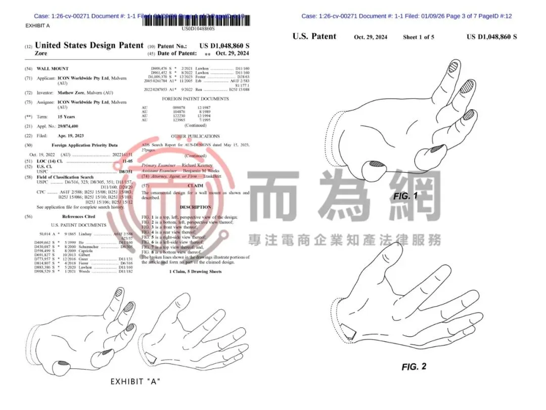 【侵权快讯】26-cv-271 家居用品类卖家注意!这款手型壁挂支架专利正在维权中!
