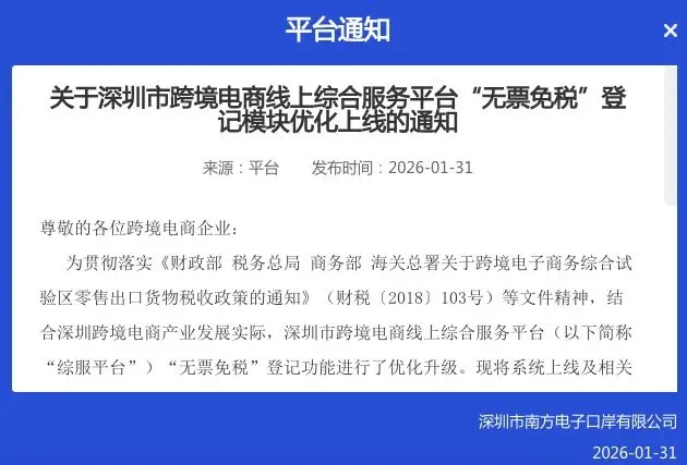 通知中还强调:市商务局从未委托任何第三方机构代理“无票免税”登记相关操作,请企业通过综服平台自行办理。