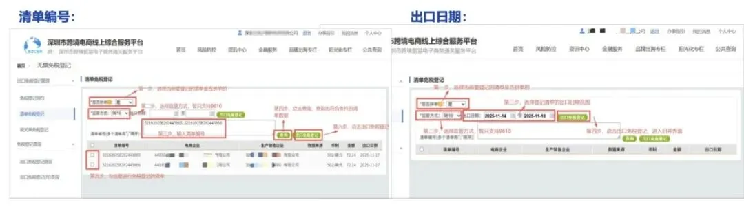 清单免税登记界面,有“出口日期”和“清单编号”两种方式分别进行清单免税登记。
