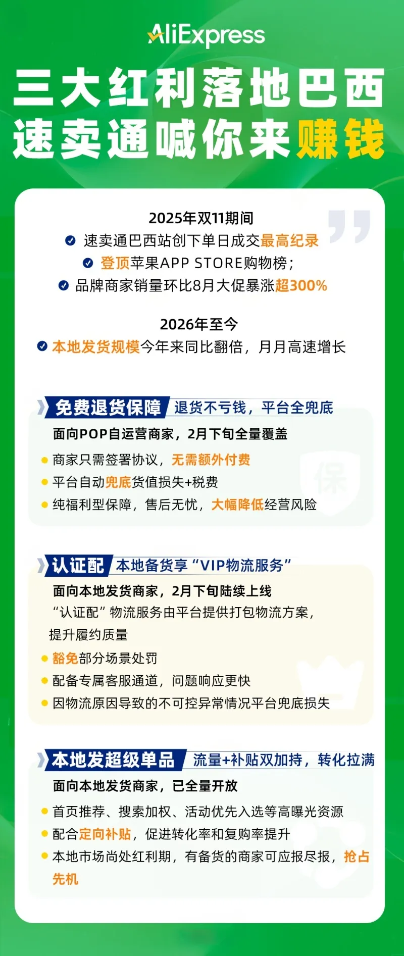 利好爆棚!速卖通巴西 3 项新政,退货 / 物流 / 流量全扶持