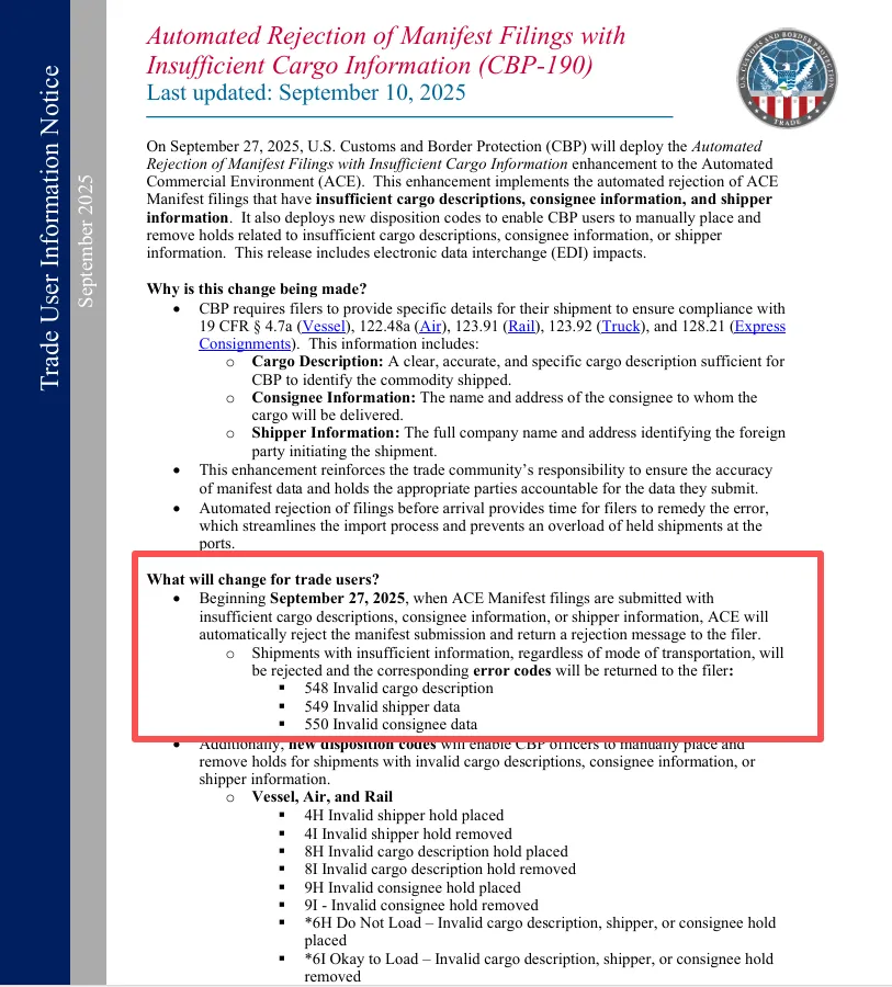 ▶ 系统升级:从2025年9月27日起,CBP就把舱单数据质量审查从人工抽样,升级成了ACE系统全量自动执行,任何信息不完整、有异常的舱单,都会被系统直接拦截,推送给审查组重点核查;