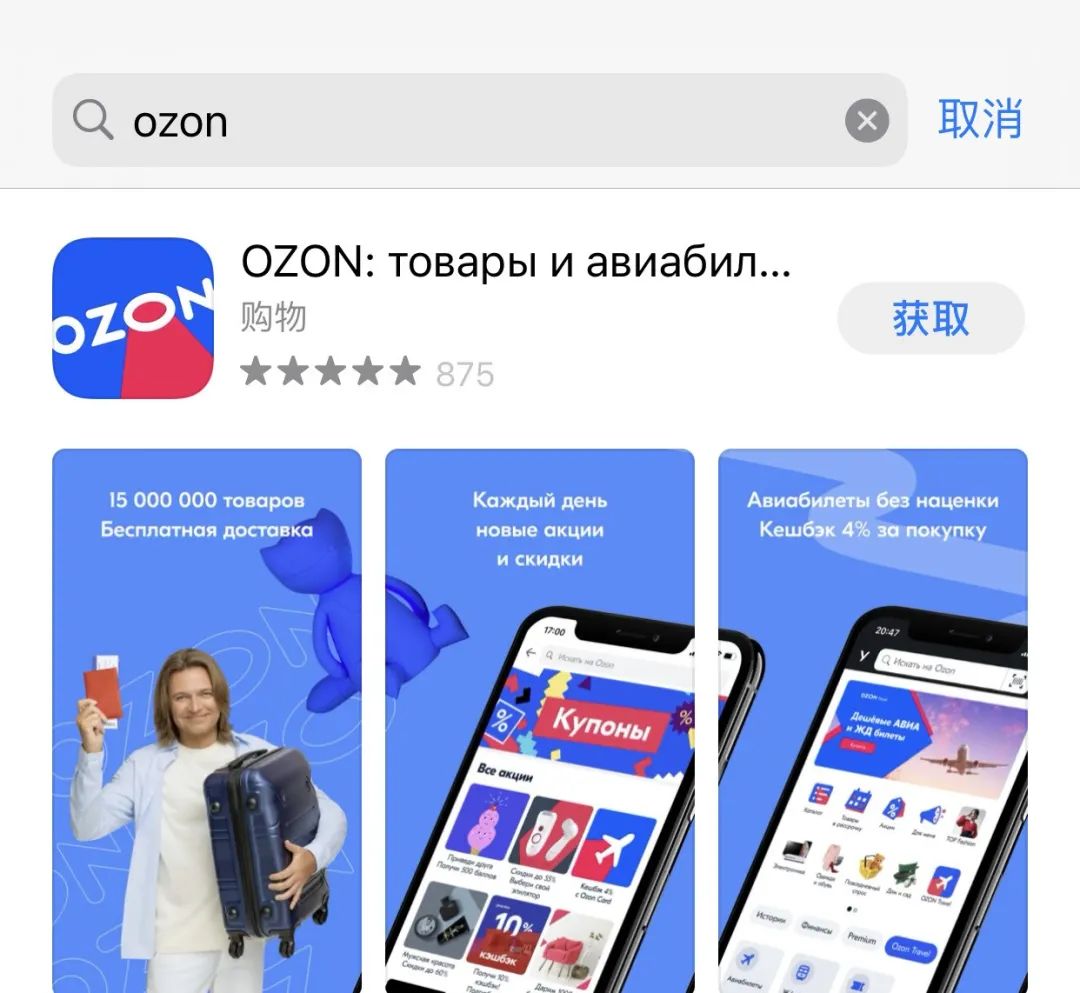IOS系统用户可以直接在App Store直接搜索OZON,就会弹出APP,然后直接下载即可