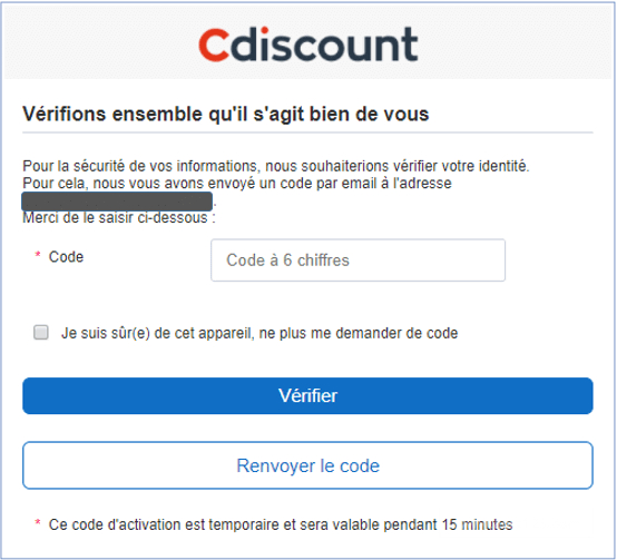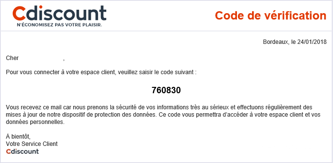 为了确保您的信息的最大安全性,Cdiscount有时需要核实您的身份。为此,Cdiscount向您的账户登录地址发送一封电子邮件,其中包括一个临时访问代码。这个代码要在一个中介页面上输入,该页面会要求你输入这个代码。