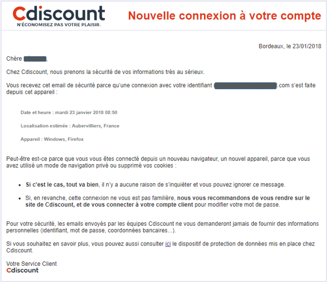 Cdiscount非常重视您的信息安全,并定期更新Cdiscount的数据保护措施。作为这个过程的一部分,每当你用你的用户名从一个未被Cdiscount系统注册的设备上登录时,你会收到一封安全电子邮件。如果你是这个连接的发起人,没有理由担心,你可以忽略这个消息。否则,Cdiscount建议你按照推荐的程序行事。