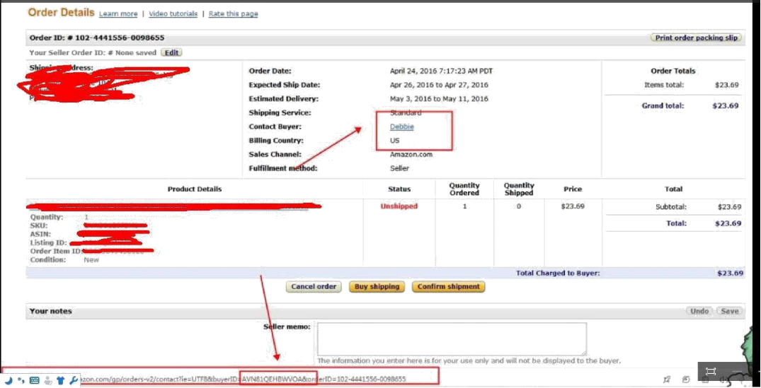 3.找到对应产品asin或者sku的订单,然后把鼠标放在contactbuyer上面,左下方就会出现对应的链接,里面包含买家的亚马逊ID,如果这个ID和你记录的ID一致,说明这个就是你要找的订单,然后可以找到买家的联系方式(如下图)