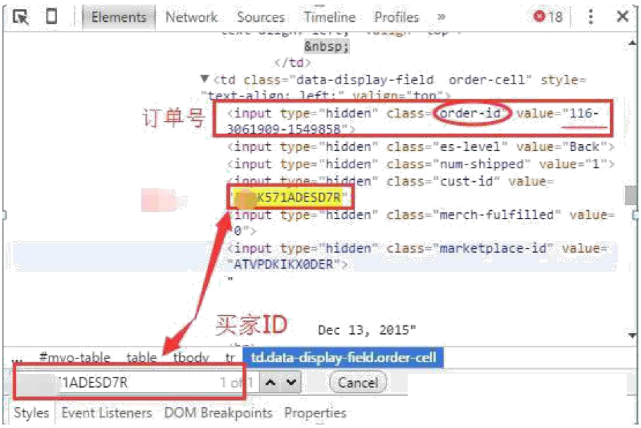 再次:我们需要在订单界面右击,选择“审查元素”,再使用快捷键“Ctrl+F”打开查询框,将先前记下的买家ProfileID号粘贴即可: