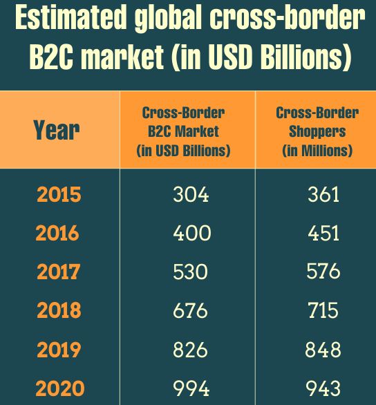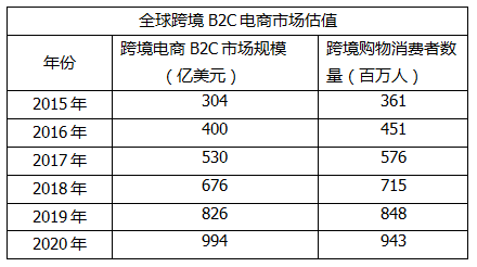 全球跨境电商B2C市场,根据年份不同,市场规模和消费者人数具体增长估值: