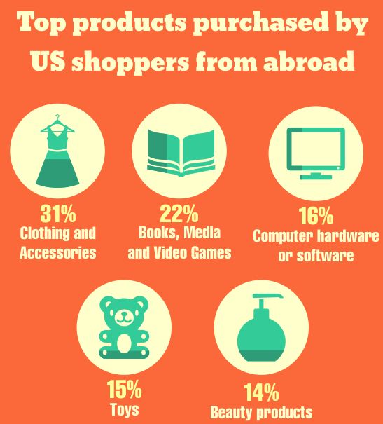 美国消费者最经常从国外网站购买的产品:服装和配饰(31%),书本、媒体产品和电子游戏(22%),电脑硬件或软件(16%),玩具(15%),美容产品(14%)。