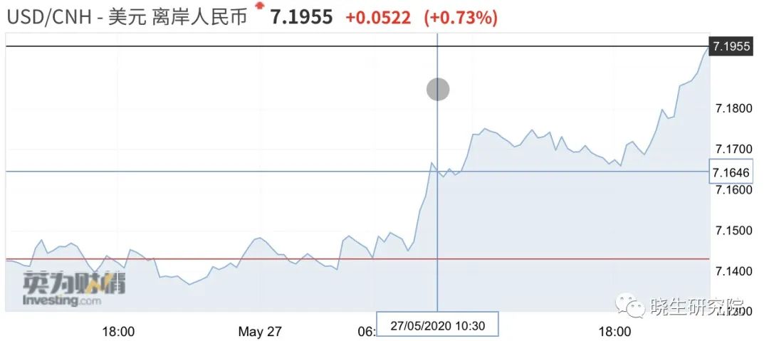 据消息,继5月27日白天交易时间跌破7.15、7.16、7.17关口后,更多反映国际投资者预期的离岸人民币对美元汇率晚间加速走低并跌破7.18和7.19关口,最低贬值至7.1954,续创去年9月初以来的新低,日内下跌近500个基点。