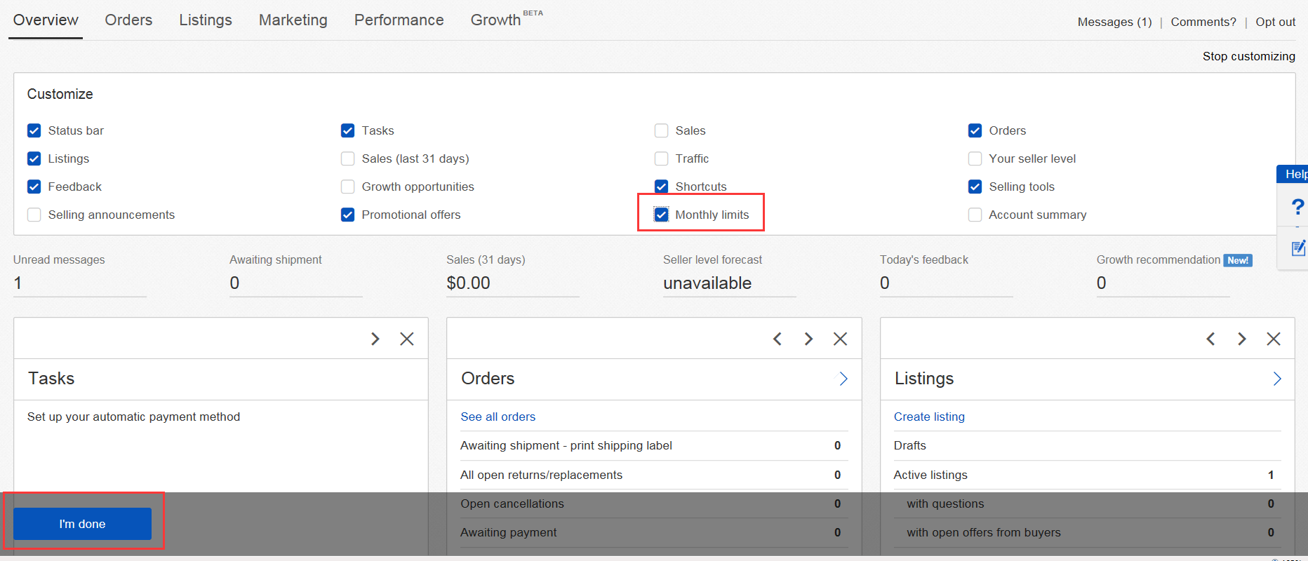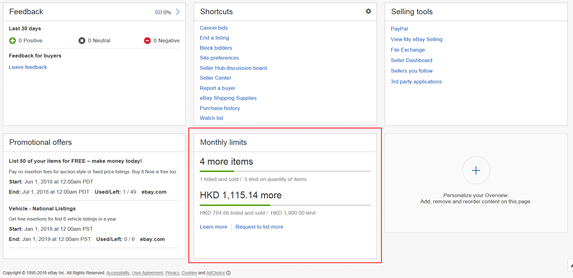 或者登录到eBay.com,在seller hub中查看每月销售额度,方法如下: