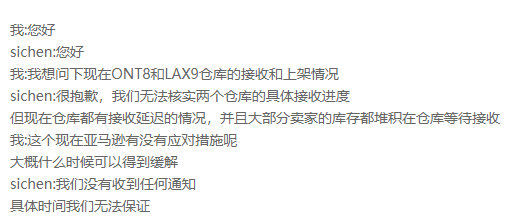 不甘心干等的卖家也开case问了客服,加利福尼亚的两个仓库ONT8和LAX9,最近货件签收和上架情况,但客服表示很抱歉,只能等待...