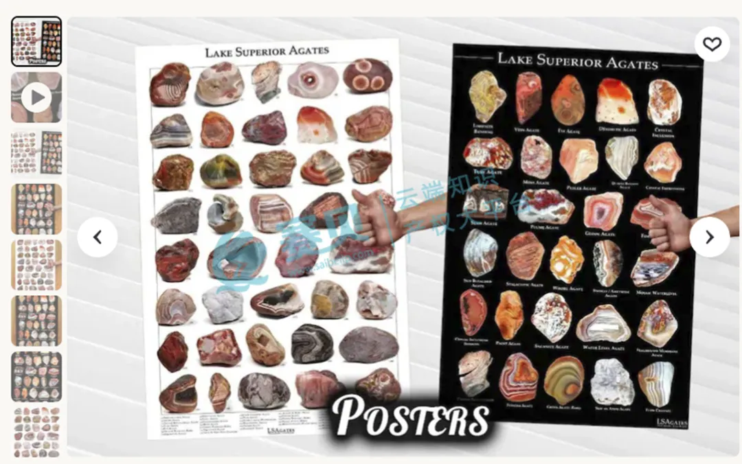 原告Lane Jacob Baguss深耕苏必利尔湖玛瑙主题创作8年,凭借大学期间的科学专业基础,将地质知识与微距摄影、平面设计相结合,打造出兼具科普性和艺术性的原创作品。其核心版权作品《LSAgates Identification Poster》(苏必利尔湖玛瑙识别海报),详细标注了多种苏必利尔湖玛瑙的种类(如褐铁矿条带玛瑙、眼玛瑙、树枝状玛瑙等),既可以作为地质科普工具,也可作为装饰海报,深受美国地质爱好者、收藏者及教育机构的青睐。