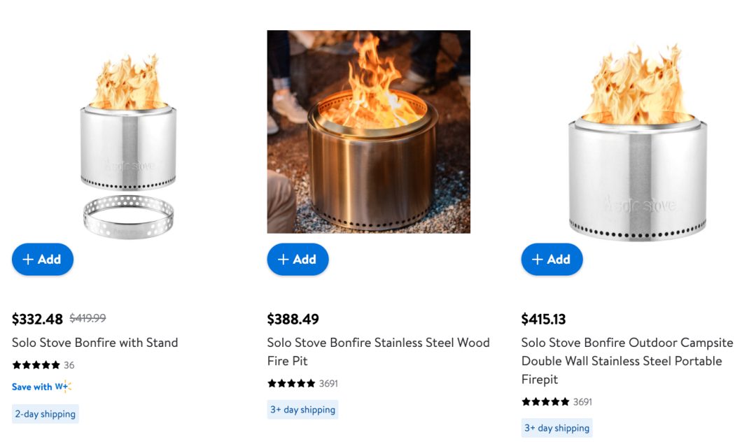 在沃尔玛,Solo Stove也是评分表现非常好,部分产品的评论数量甚至比在亚马逊平台上更高。这在类目竞争普遍不如亚马逊的沃尔玛平台上,是比较少见的。