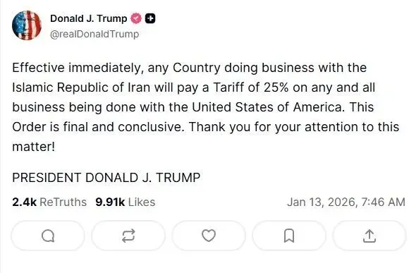 刚刚!特朗普:对伊朗贸易伙伴加征25%关税!立刻生效!