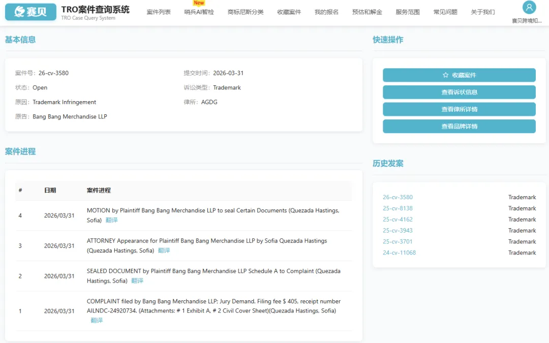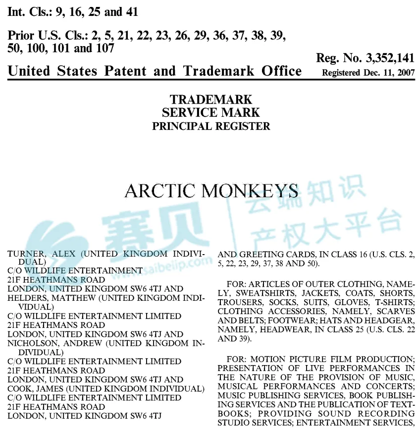 从赛贝TRO案件查询系统获悉,2026年3月31日,美国法院正式受理一起商标侵权TRO案件,该案由AGDG律所代理英国企业Bang Bang Merchandise LLP发起,核心指向其“ARCTIC MONKEYS”(北极猴子)文字商标侵权行为,该商标风格贴合摇滚乐队调性,简约大气且具有极高辨识度,涉案商品涵盖影音载体、服饰、文创办公用品等多个品类。