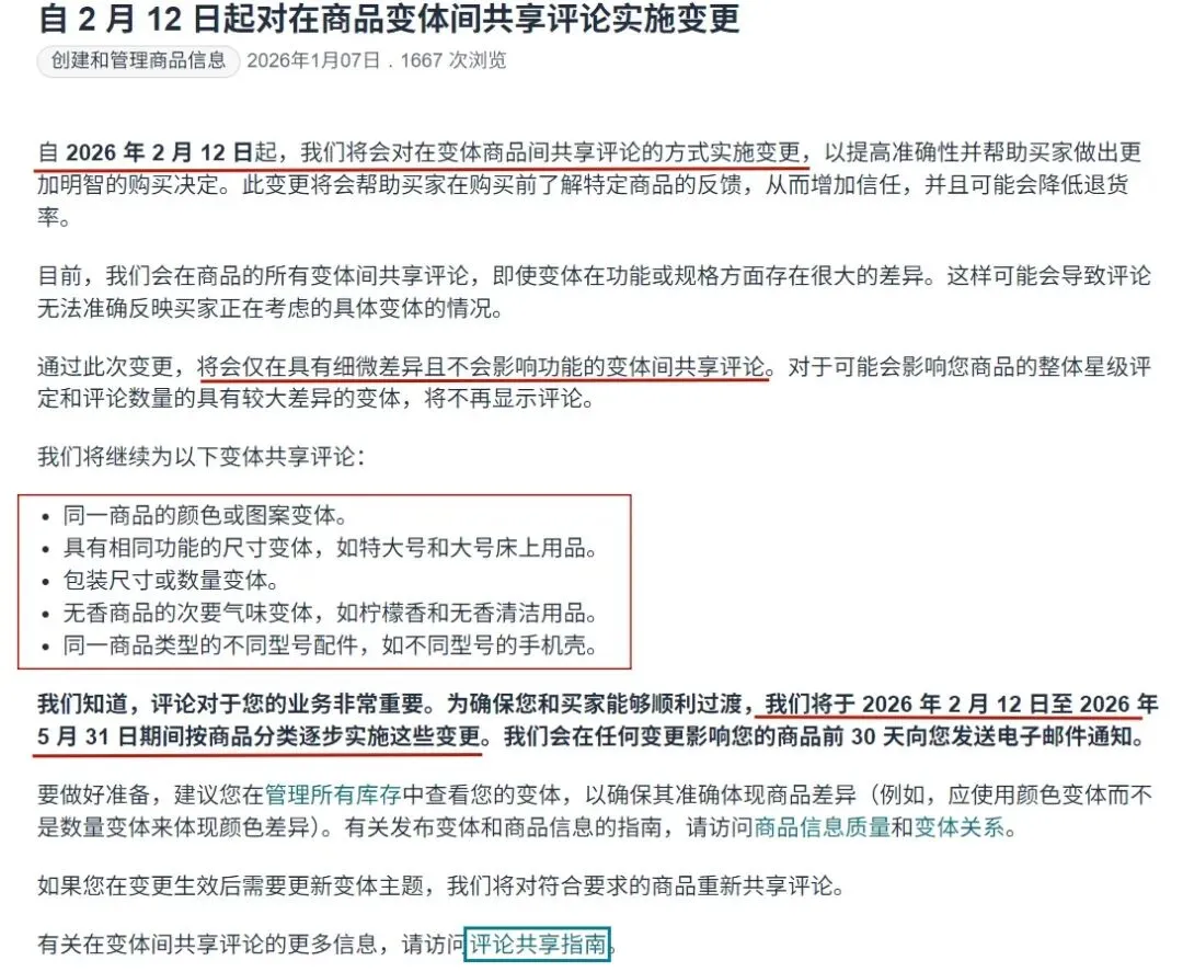 在物流端变革的同时,亚马逊对前端的流量与评价体系也做出了重要调整。平台宣布,自2026年2月12日起,将严格限制产品变体之间的评论共享。