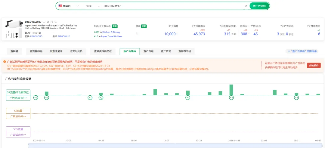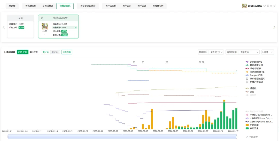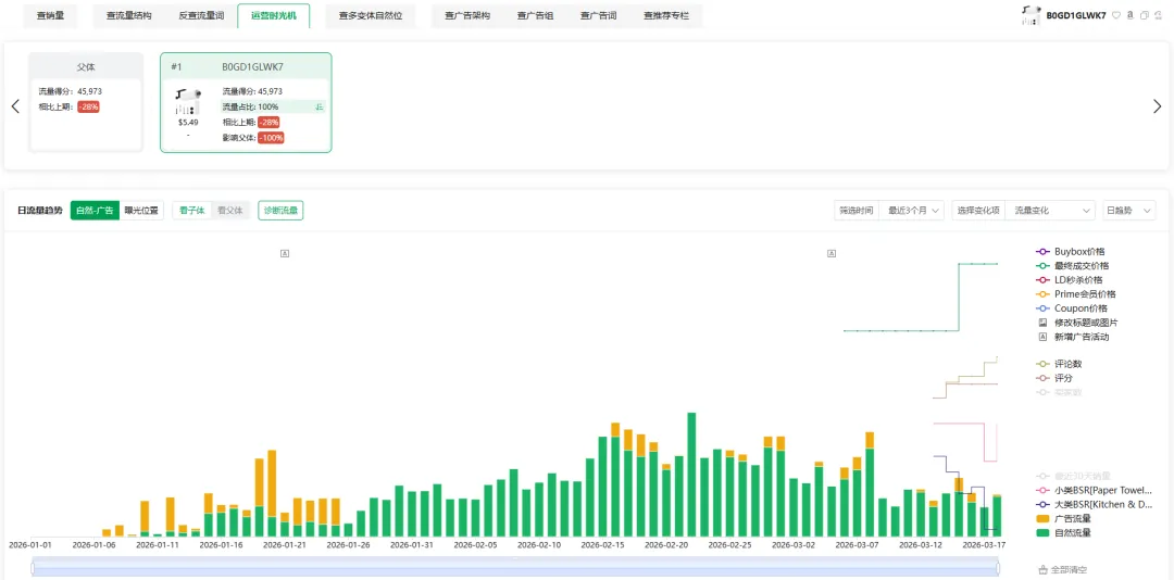 纸巾架那个,1月7号到1月25号,流量结构里广告占绝对主导。没评价,没权重,什么"养链接"的前置动作都没有,上来就是SP广告核心词全拉。然后1月26号,转折来了——自然流量反超广告,此后一直是自然主导。中间2月15号之后偶尔补点广告稳排名,但大局已定。