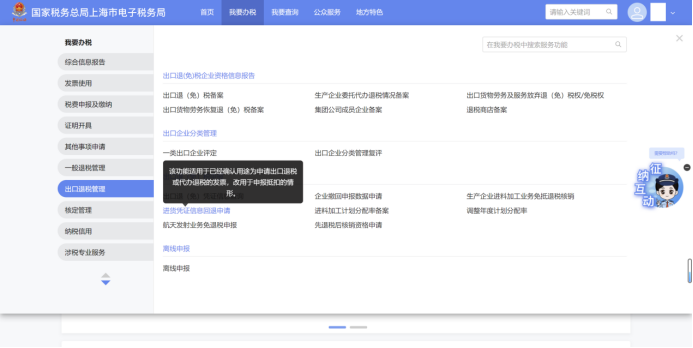 通过【我要办税】 -【出口退税管理】-【出口退(免)税申报】-【进货凭证信息回退申请】;或者通过首页右上角搜索栏输入“进货凭证信息回退申请”进入。