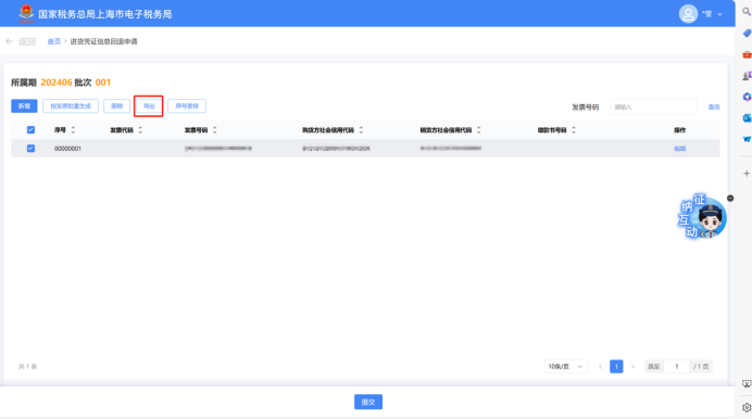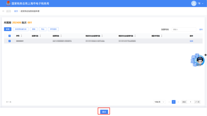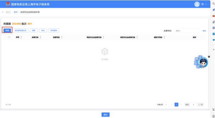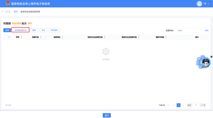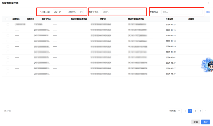 可点击【按发票批量生成】按钮,进入勾选界面,可通过“开票日期”、“缴款书号码”、“发票号码”进行查询后勾选需要批量生成的数据。