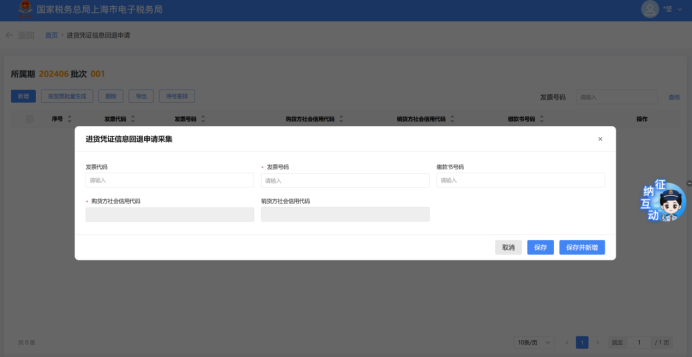 点击【新增】按钮,弹出“进货凭证信息回退申请采集”页面,可根据系统提示录入相关信息,进行申请信息采集。