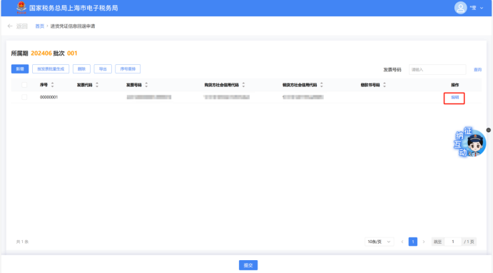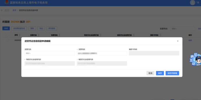 点击明细数据对应的【编辑】按钮,弹出“进货凭证信息回退申请编辑”页面,进行数据编辑修改。