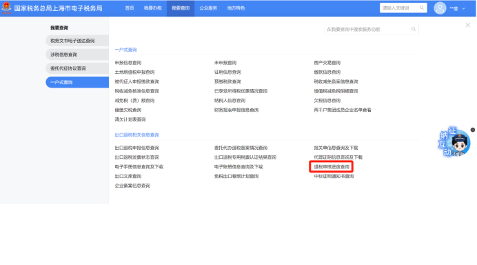 登录新电子税局,点击【我要查询】-【一户式查询】-【出口退税相关信息查询】-【退税审核进度查询】功能菜单。