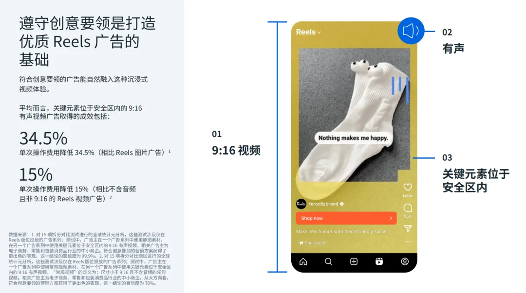 当素材形态更匹配(9:16 + 有声 + 节奏适配),系统更可能把部分预算倾向到 Reels 等视频友好环境,带来: