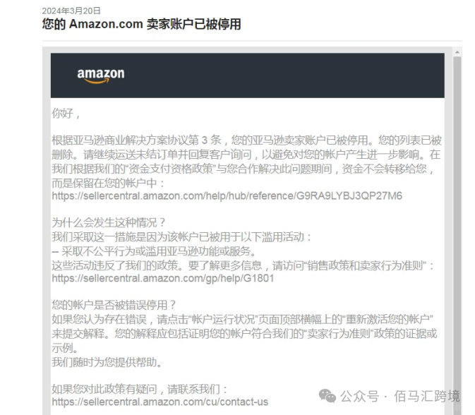 但是,昨天下午,大批量账号被直接停用,且分批进行,涉及多个老账号。亚马逊邮件称这些账号存在滥用问题,卖家对具体封号原因毫无头绪,心急如焚。对此,有经理推测这是常规的大促前清扫,只是对原本审核宽松的操作按条款从严执行了。