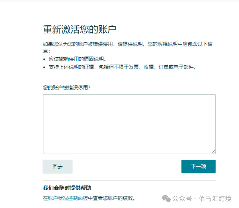 如果卖家认为亚马逊封号有误,可以点击“账户运行状况”页面顶部横幅上的“重新激活您的账号”来提交说明。解释说明内容应包含:
