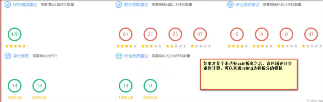 卖家可利用Fusionzoom Tools,在查询父Asin时,将Listing页面中所有子Asin的评分展示出来,且可以对未达到期望评分的子Asin进行拆离模拟评分计算。