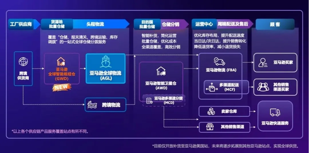 在GWD模式下,亚马逊通过AI算法分析各站点实时销量、库存情况及销售预测,自动分拨货物至目的国FBA前置仓,目前已开放美国站智能补货服务。头程物流方面,开通中国至美、欧、英等线路,新增越南始发地及越美海运航线,预计可将头程时效缩短至5天左右。