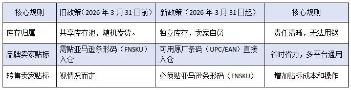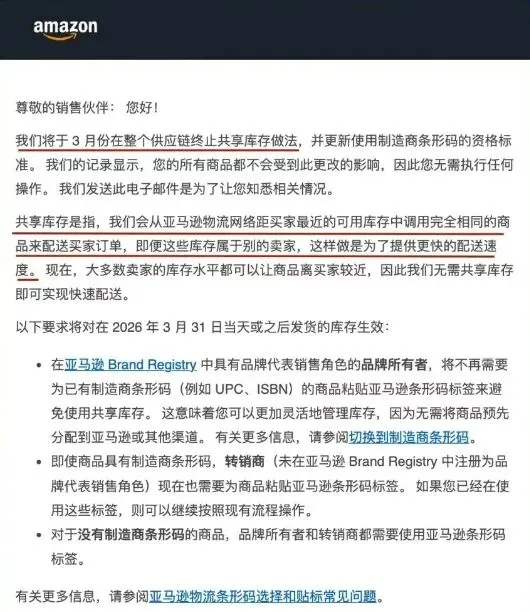 亚马逊官宣自 2026 年 3 月 31 日起全面终止共享库存模式,同步更新制造商条码使用标准,核心变革体现在三方面: