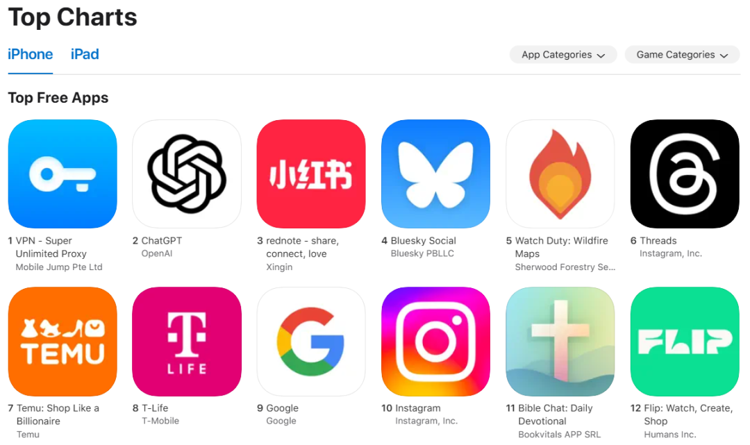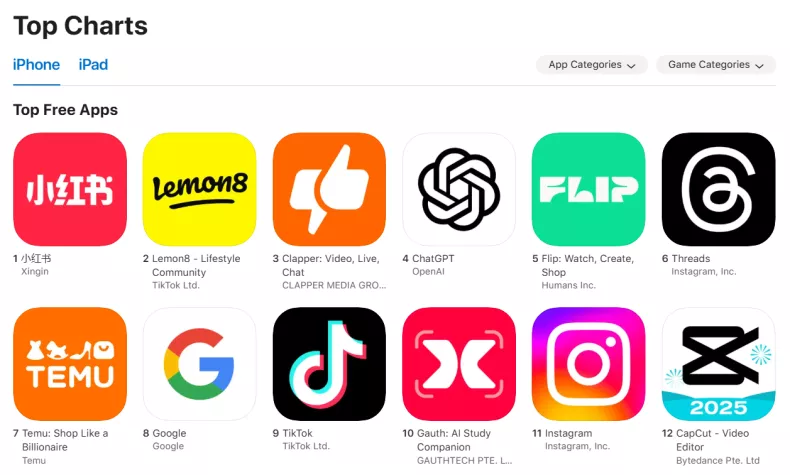 2025 年 1 月 16 日苹果 App Store 免费应用排行榜