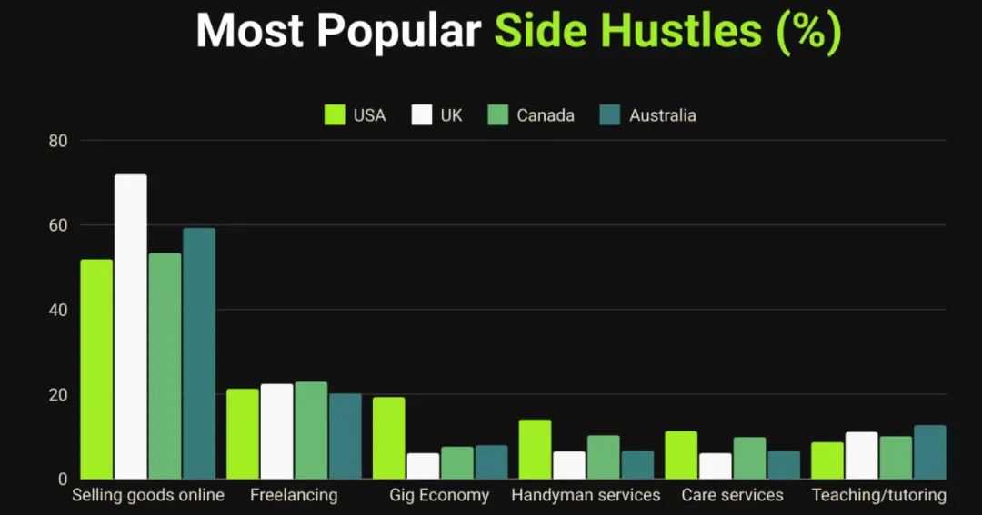 营销工具公司 Omnisend 的一份调查报告显示,在所有副业里,最受欢迎的副业是做电商,有51.9% 的美国受访者选择通过在网上销售产品来赚取外快,加拿大为 53.4%,澳大利亚为 59.3%,英国这一比例则高达72%。