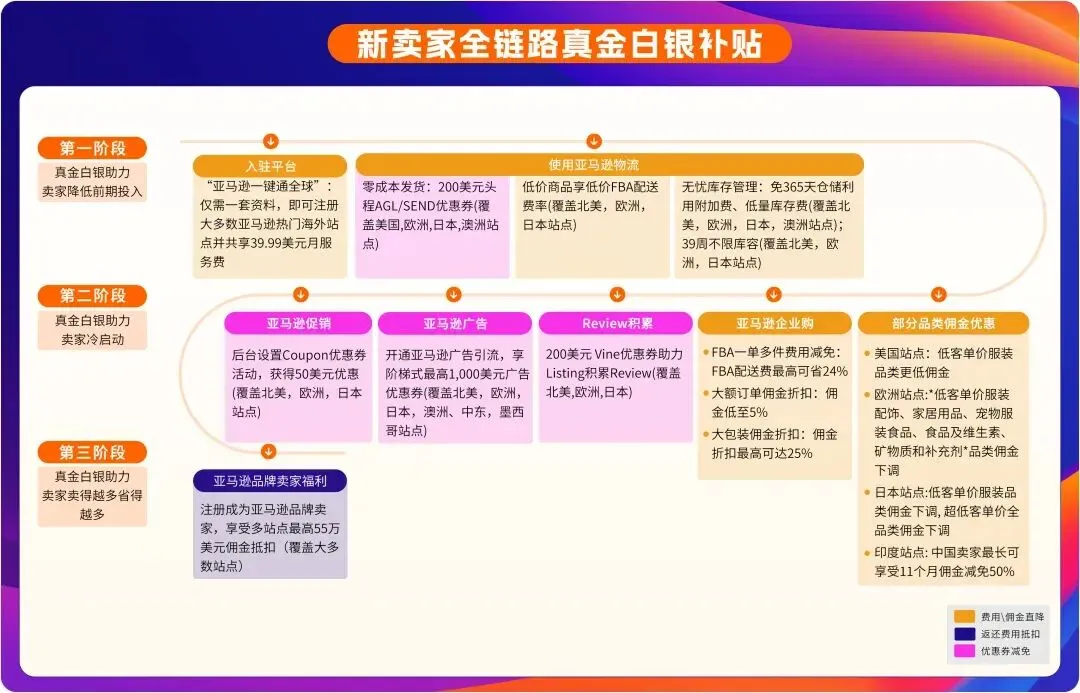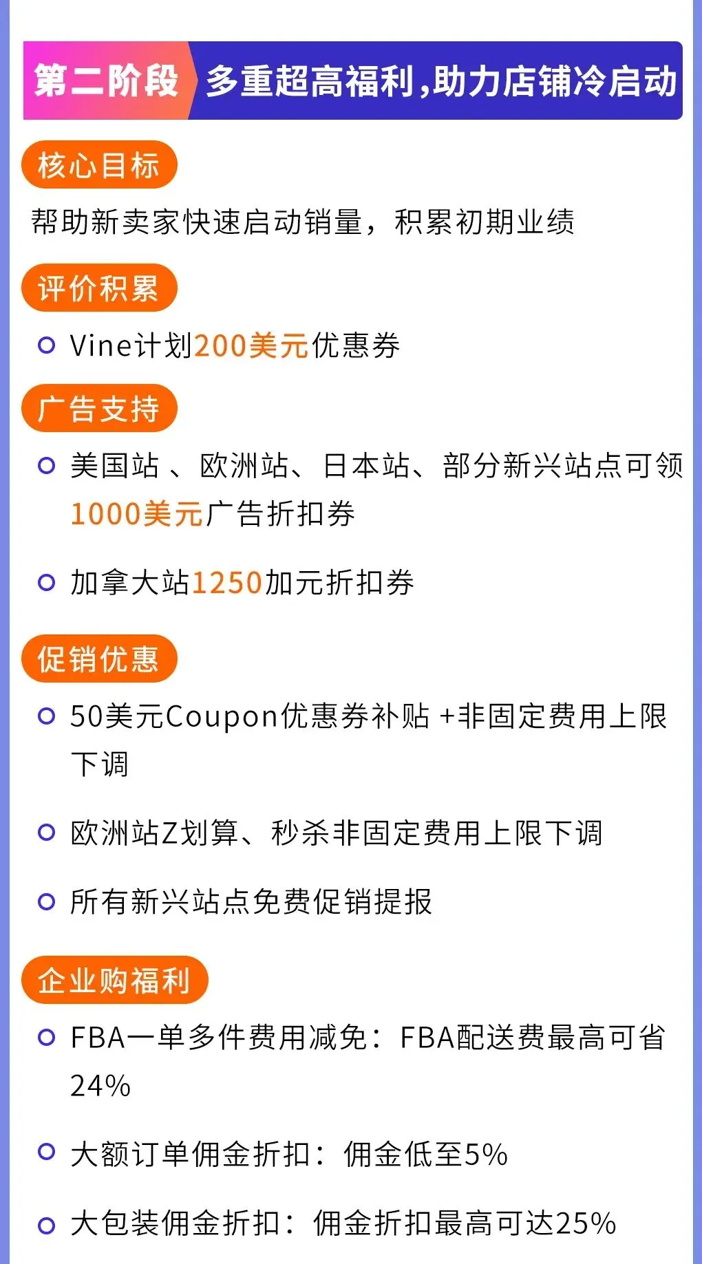 卖家应该特别注意分阶段合理规划资源投入。在开店阶段充分利用物流和仓储费减免;在冷启动阶段积极使用Vine评论和广告补贴;在增长阶段则最大化销售额返还效益。