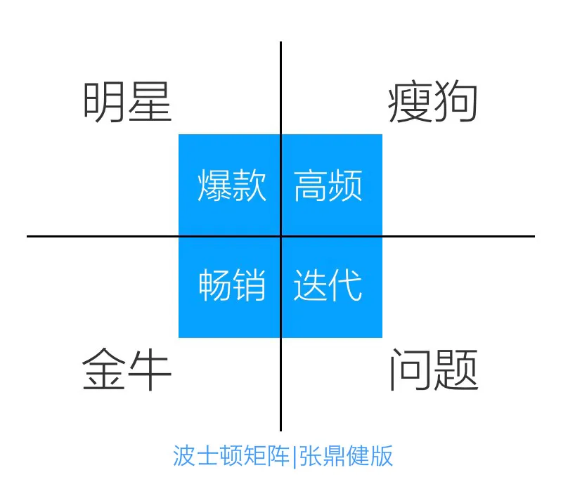 但是,面对互联网的玩法,我把这个产品结构重新演绎成:1、畅销的金牛产品,爆款的明星产品,高频的瘦狗产品,迭代的问题产品。