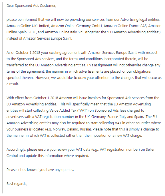 邮件中称,PPC广告服务转移到欧盟的亚马逊广告实体,并且从2018年10月1日起,亚马逊将向欧盟的亚马逊广告实体开具赞助商广告服务的发票。这也就预示着欧盟的亚马逊广告实体将开始对在英国、德国、法国、意大利和西班牙注册了增值税的广告商收取的赞助商广告费用征收增值税(“VAT”)。欧盟的亚马逊广告实体也可能被要求在你的业务所在地的其他国家(如挪威、冰岛、俄罗斯)开始征收增值税。请注意,这只是对增值税征收方式的改变,而不是征收新的增值税。
