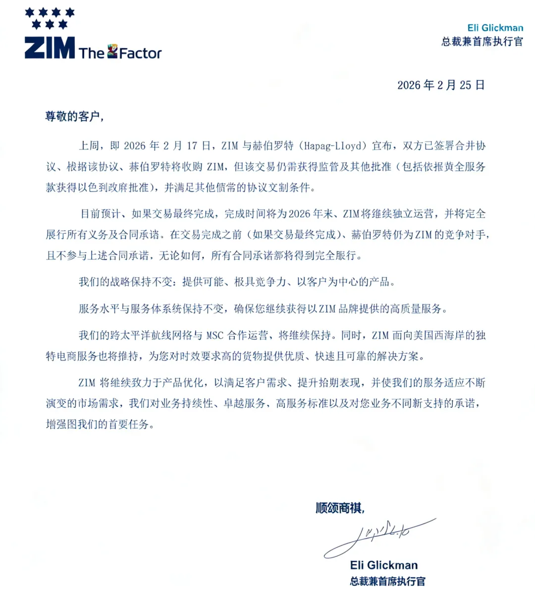 上周,即2026年2月17日,ZIM与赫伯罗特(Hapag-Lloyd)宣布,双方已签署合并协议。根据该协议,赫伯罗特将收购ZIM,但该交易仍需获得监管及其他批准(包括依据黄金股条款获得以色列政府批准),并满足其他惯常的协议交割条件。