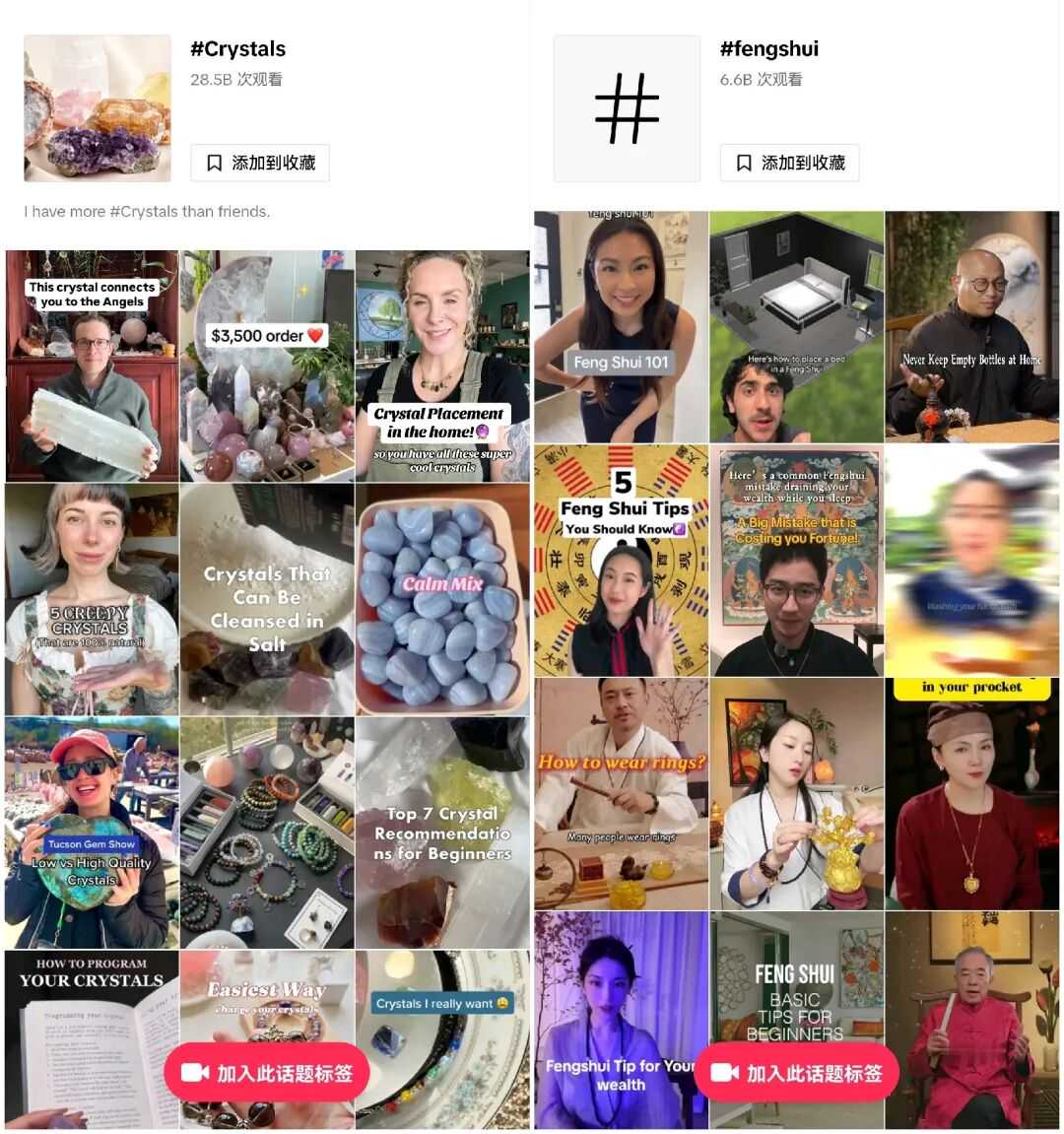 这些宏观数据,不仅说明了玄学经济的崛起,也解释了社交媒体上的玄学热潮——#fengshui(风水)话题标签累计观看量超过66亿次,一条根据风水判断床头方向的视频,收获了97万点赞;而在东西方神秘学中都至关重要的水晶,相关话题观看量更是达到了惊人的285亿次。