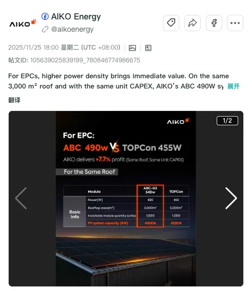 在海外市场,笼统的“技术领先”难以形成信任,真正能被理解和转述的,是清晰、可量化、可对比的数据表达。如爱旭科技(AIKO)在海外传播中,会以极为直观的数据方式呈现其技术优势:在相同组件面积、相同单位资本支出的前提下,其最新电池技术能够带来更高的发电量输出。