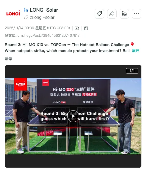 因此,隆基绿能(LONGi)在海外社交媒体中,选择以短视频“PK”的方式,模拟极端天气或热点事件发生后的组件防护能力,通过可视化方式强化技术可信度。