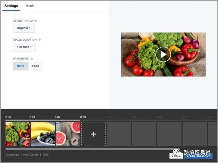 在广告创建工具中,您可以使用多张图片或一个视频轻松创建投放于 Facebook 和 Instagram 的幻灯片广告。如果您想创建样图,并在稍后发布,请尝试在创意馆创建幻灯片。
